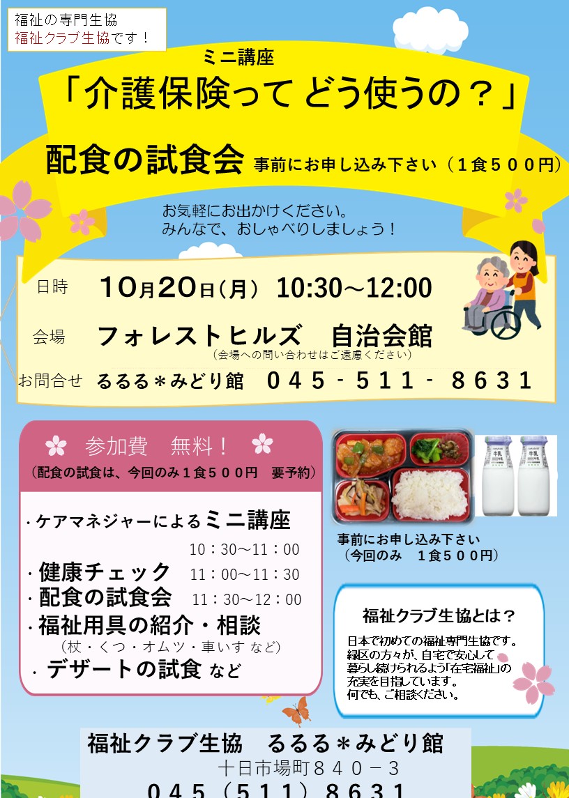 new! 10/20(月)緑区三保町のフォレストヒルズ自治会館にて、